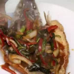 Knoblauch und Ingwer goldbraun anbraten. Gemüse dazugeben, goldbraun anbraten, Reiswein hinzugeben; braten; Brühe hinzugeben; würzen: Sojasauce, Pfeffer, Thai-Chili Sauce, Zucker, Salz, frische Koriander; Binden und Sauce über den Fisch geben;